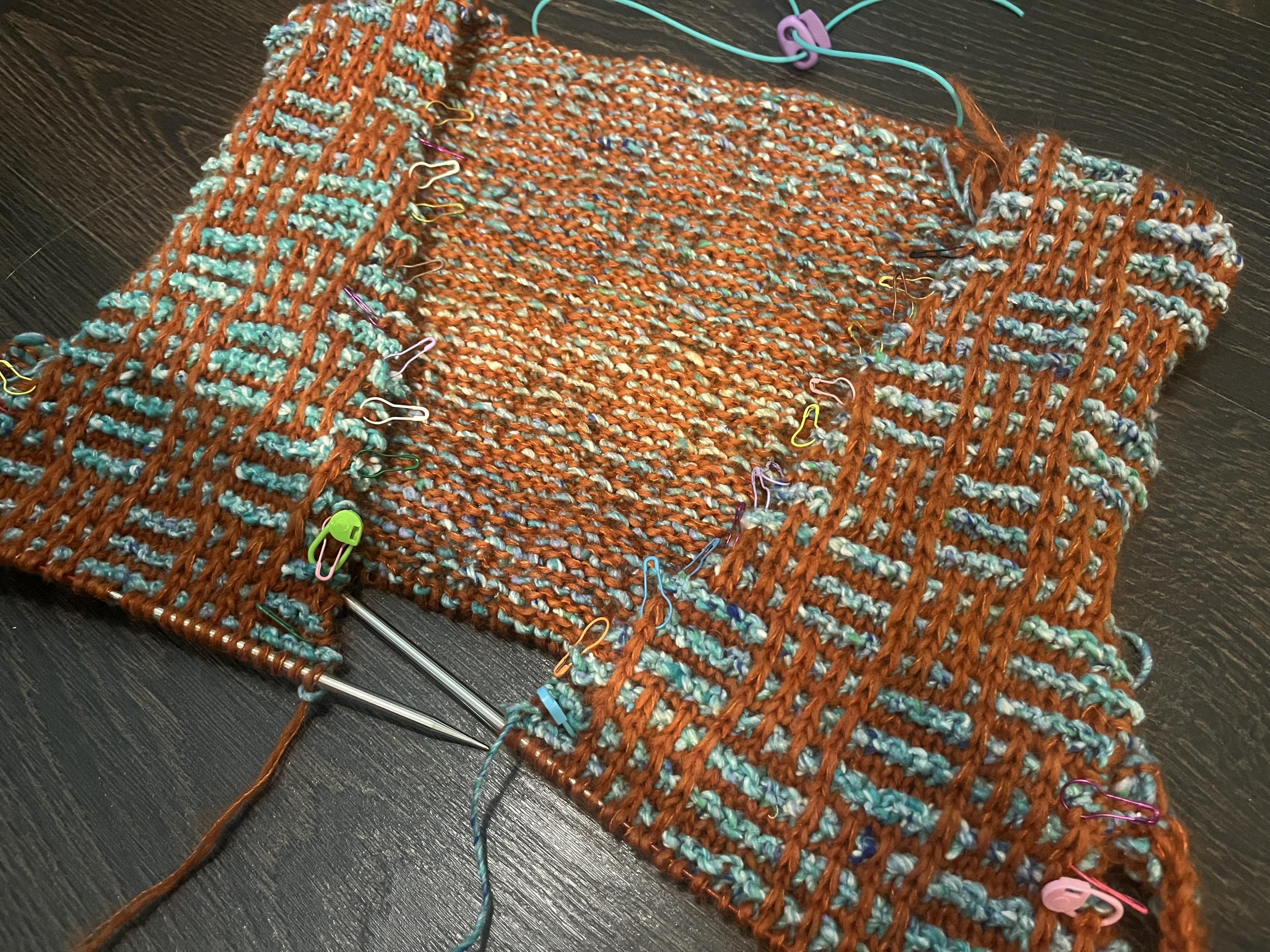 #毛线球 body 快织完了,昨天就先把两边 armhole 都织了 rib 但都有点问题,一边忘了换小一码的针,另一边织多了两行 😅 想返工,Italian bind off 拆起来还挺麻烦的等晚上再弄吧……