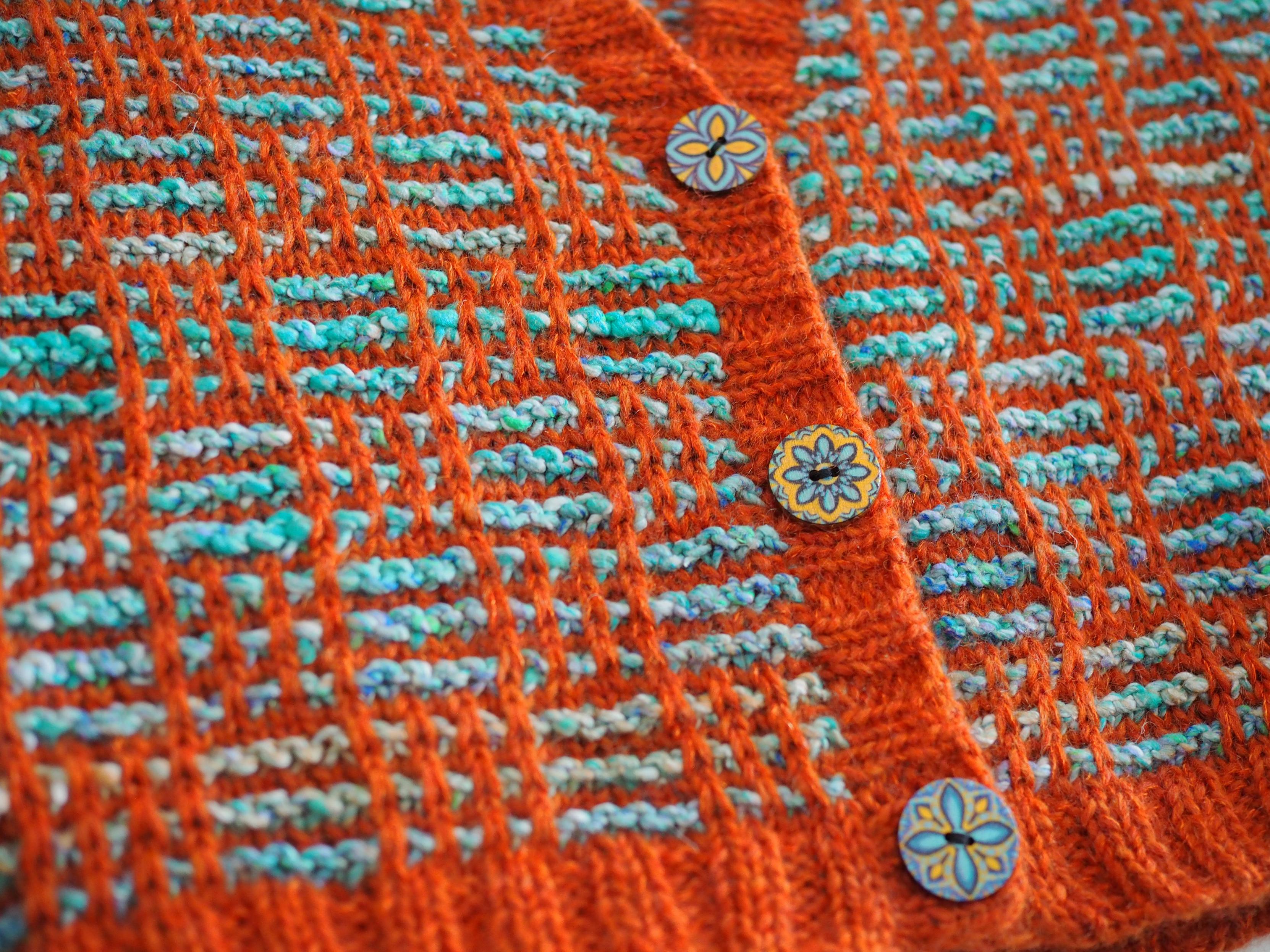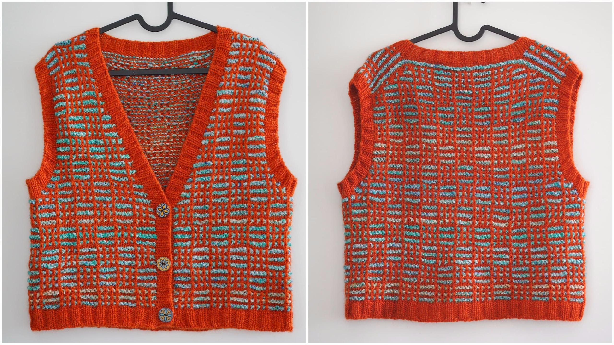 下午织了一点背心,发现橙红色线还是太细了,swatch 还看不太出来但面积已大就显得图案太花。