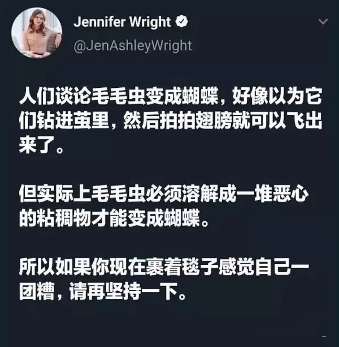 ↓↓↓于是我去搜了一下毛毛虫到底是怎么变成蝴蝶,简直下巴都惊掉了,从小被教育的都以为是毛毛虫在茧里长翅膀,实际上毛毛虫进茧以后第一件事是分泌出很多酶把大部分自己溶解掉,然后用这些尸水的营养把自己重新“怀一遍”——发育出新的蝴蝶的翅膀眼睛等等😶