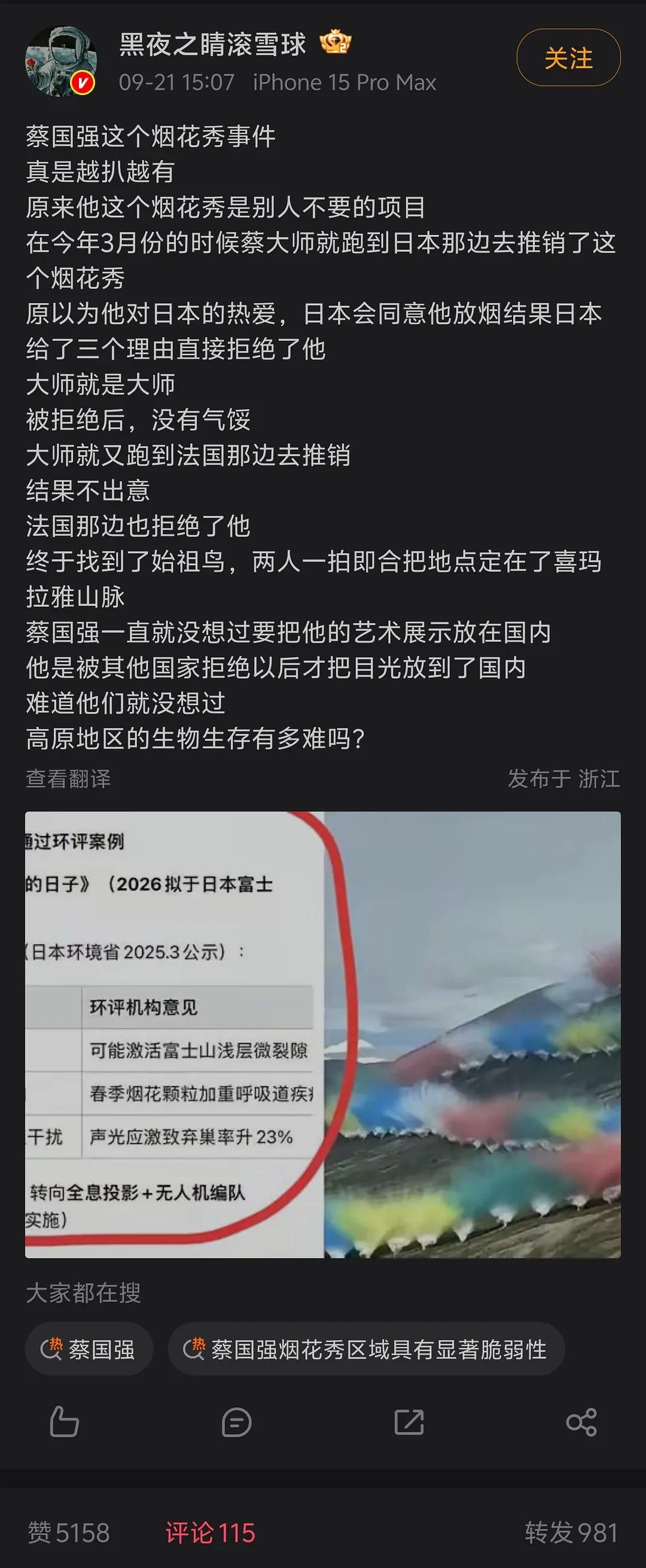 日本政府对于,蔡国强打算在富士山搞爆破的意见是1.可能把富士山炸裂 2.粉尘会让人呼吸道得病 3.会让野生动物吓到弃巢,所以拒绝🙅🏻♀️法国政府也是一样。只有咱们中国政府专收别人不要的垃圾!“把我当日本人整”=“把我当中国人整”。