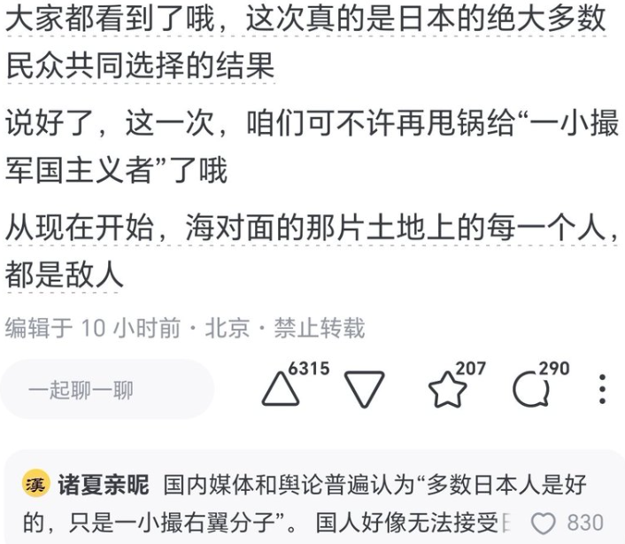 笑死,看起来是放狠话,其实是嘤嘤怪。以中国官方二十多年如一日的全面敌对的宣传导向,日本现在才全面右转,已经是给足面子了。“核平”之类的反人类(都不只是反日)口号喊了二十几年,现在人家终于认真地把你当成对手,你才意识到“以后就是敌人了”,不然咧?你以为你之前都在干啥?“哼那以后就是敌人了”,嘤嘤给谁看呢?