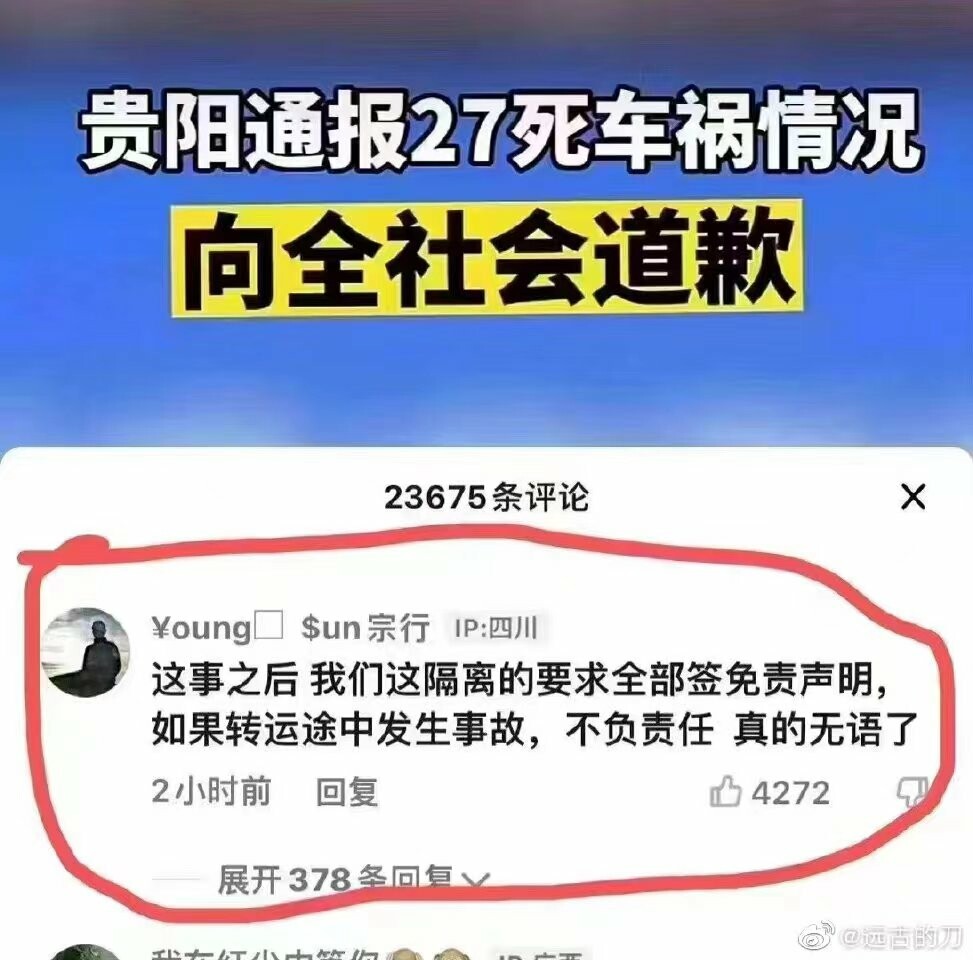 先不聊为了清零指标深夜转运十五天阴性人员的正当性在哪,其转运程序本身就有极大的疏漏。首先最基本的认识,为了保证出行安全,客运车辆在凌晨2点到5点不准进入高速公路行驶,以此防止疲劳驾驶。人在凌晨2-5点保持清醒状态是很困难的,更何况是在白天没有准备的情况下。司机还穿了防护服戴了面屏,对视线造成了干扰,氧气的供应也存在问题。(其实完全可以司机乘客用屏障隔开,司机可以在这样的情况下敢在贵阳这样地形崎岖的高速路段行驶,出现问题的风险极大增加。再者是载客数量问题,本来为了减少感染,更应该是间隔就坐,一辆大巴在间隔就坐的条件下能载运47个人吗?既然可以打着防疫的口号运人,为什么不按防疫的要求控制人数?以上这些问题好像也不难规避吧,就算是要清零转运,在合理的时间段使用合理的驾驶方式载运合理的人数,这样的悲剧都不会出现。致27个死亡,以新冠等效下来得感染多少人。
