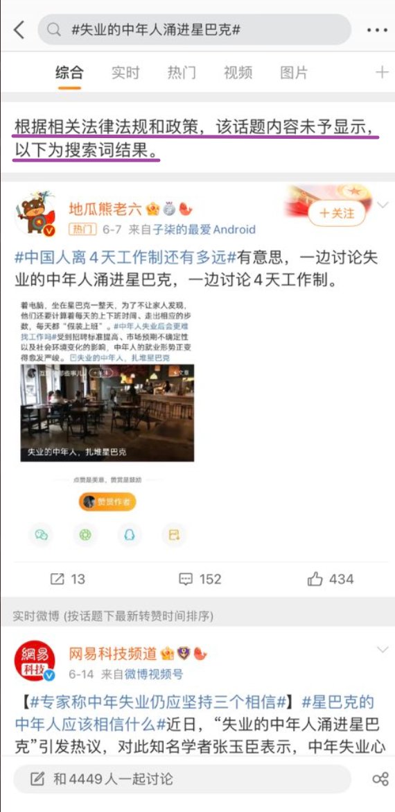 然而,6月15日,有网友发现“失业的中年人涌进星巴克”这一话题已经被封禁。