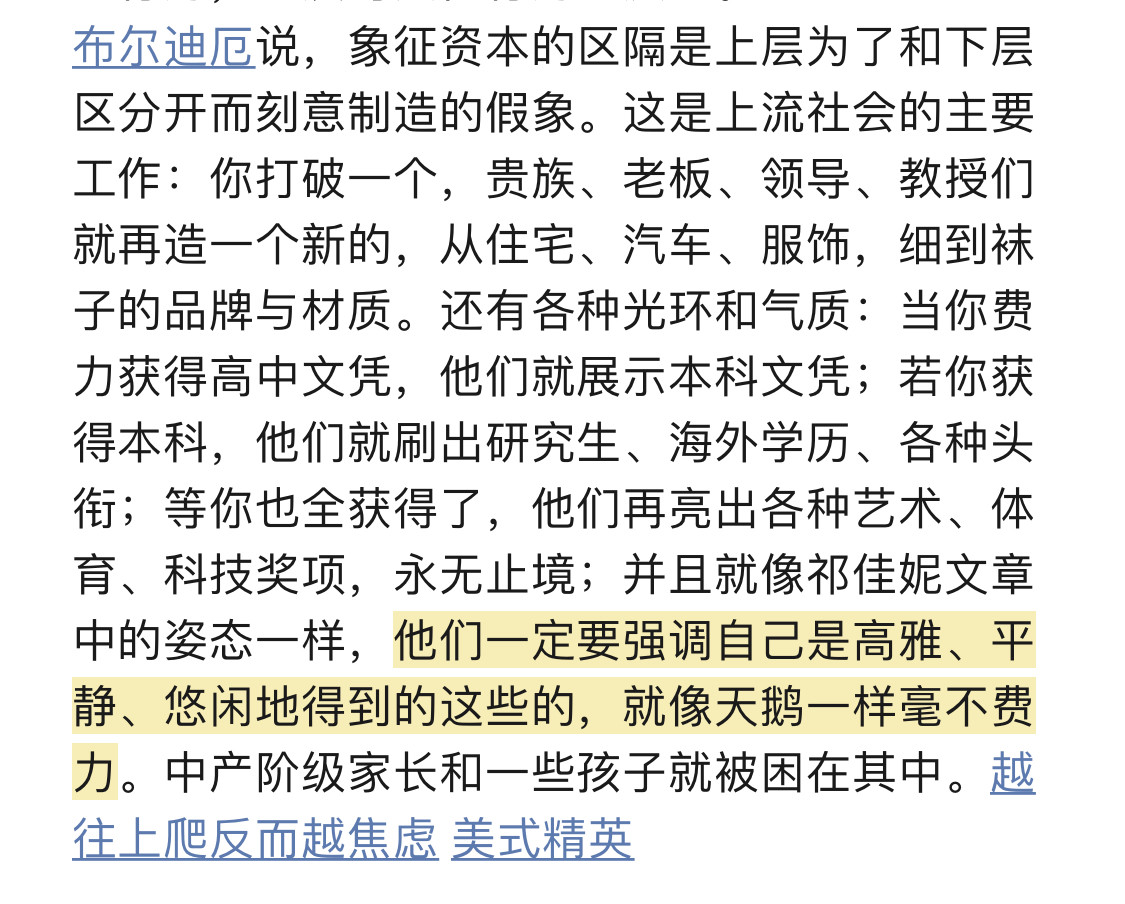 只是标准不一样,并不代表“精英素质教育”就不标化了。中国应试教育可以把学生标化成几张考卷和一个数字,但在“素质教育”里,家庭背景、兴趣爱好、社会活动也都成了标准,根本就没有不应试的教育晋升体系,因为没有标准就无法筛选了。只是有的考试是明确的,有的考试根本看不见,但看不见也不代表不存在了,反而是让人把整个人生都活成了考试。。