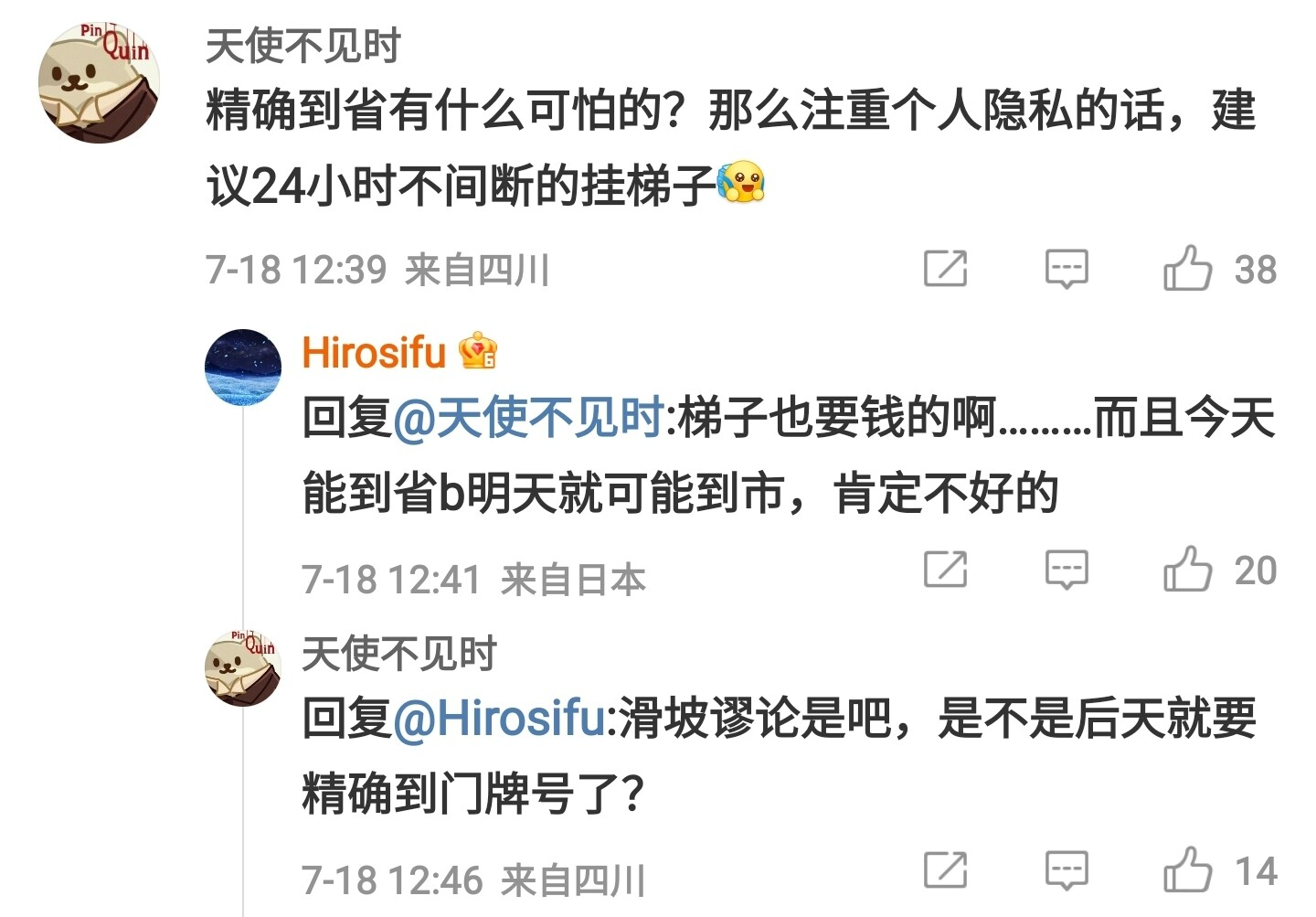 逻辑学时刻:“滑坡谬误”之所以是谬误,是因为1、一个做法被推到极端时是错误的,不一定证明这个做法本身是错误的;2、这种被“推到极端”的趋势本身不一定是成立的。但是在这轮对话里,首先,“今天能定位到省,明天就可能定位到市”这个可能性是现实存在的,就算是“定位到门牌号”,技术上也早就实现了;其次,也是最关键的,“滑坡谬误”的前提,是对方希望通过滑坡来进行论证,但是在这个对话里,对方提出这个滑坡,并不是为了证明“定位到省是不对的”(这个做法的不妥,根本不需要通过滑坡到更极端情况来论证),而是为了说明,这个做法的弊害,比它表明上看起来的还要大。由于本来就不是为了证明,而只是为了说明,所以也不存在“滑坡谬误”的问题。