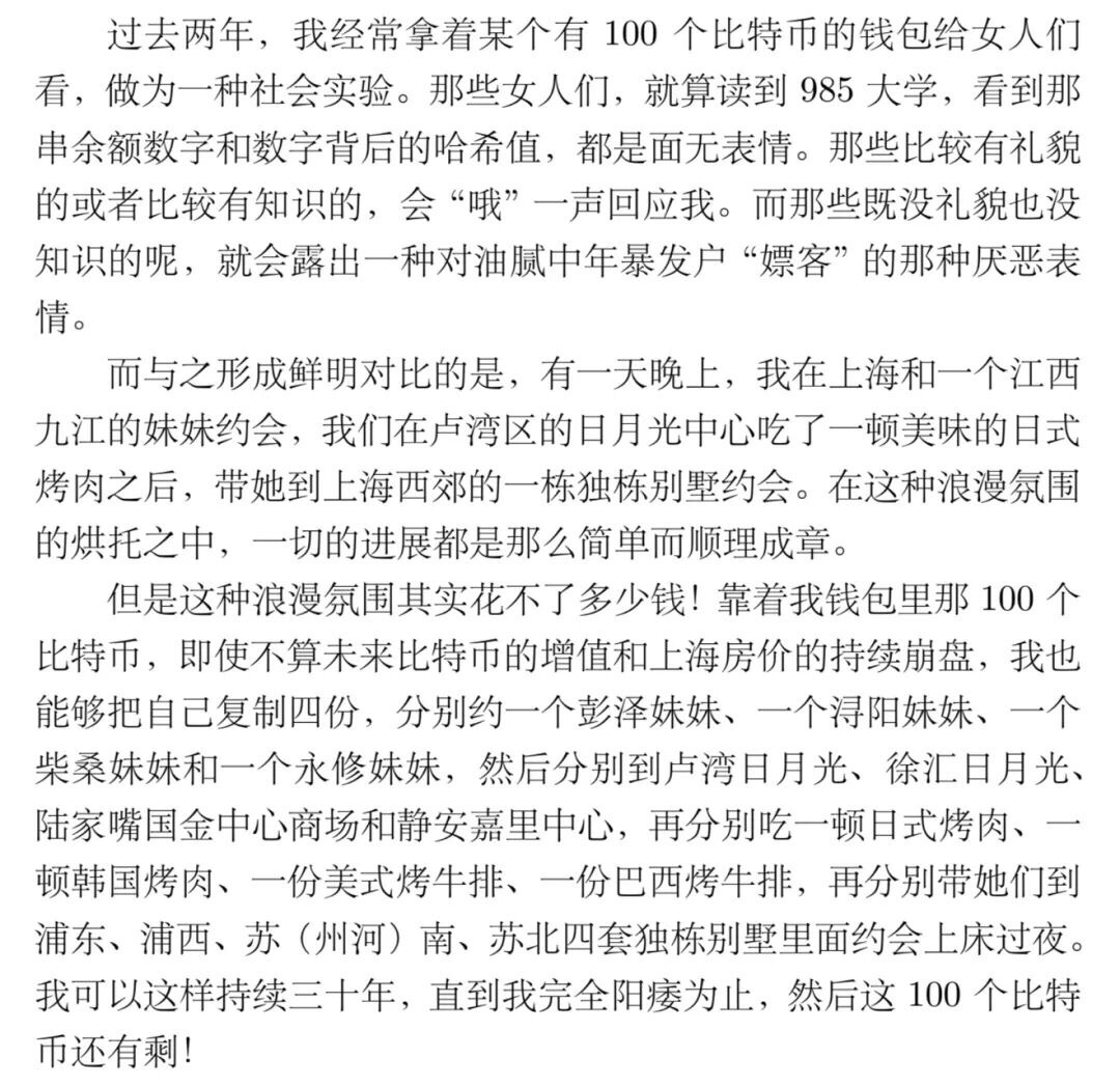 男人,如果学不会尊重异性(也就是成为在简中两头挨喷的“女权男”),就不可能幸福。因为男权叙事打根儿上就是拧巴的。你看李新野这段描述多搞笑——女人看到我的账户没反应,她们只喜欢美好的约会。不然嘞?你又不是转了一百个比特币给她,你的钱袋子晃得再响关别人屁事啊!而且就算你转了钱给她,美好的体验也是来自约会本身而不是钱啊。李新野清华姚班出身,而且完全知道亲爹是个傻逼,所以他不是智商不够,也不是不反爹。他只是从没反思,过作为文化传统的“爹”,本质甚至都不是男权,而是不把人当人。而为什么这个绝顶聪明的男人会如此愚蠢,以至于以为女人应该因为他的富有和聪明而爱他,而不是因为相处的愉快而爱他?因为“不把人当人”,进而是不把自己当人,是老中人的出厂设置。甚至在浪漫的约会中,明明感觉幸福,却不觉得这是一个人和另一个人愉快的相处,而是满脑子想着“这个女人真肤浅,不知道欣赏我的财富”,or“这个女人真肤浅,这么点小钱就能睡到”。这么拧巴的人,除了女骗子,谁能伺候得好?