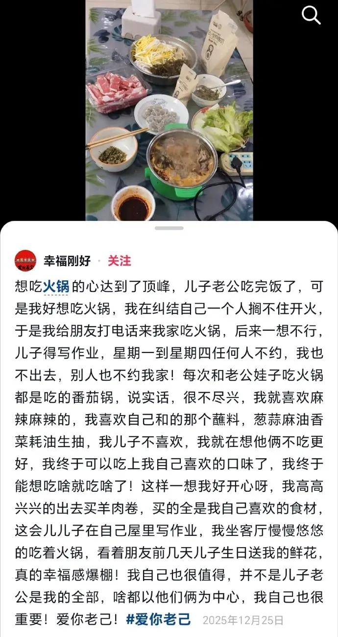 人生经验有点冷血哈——主妇确实很辛苦。但图中的主妇是为了儿子和丈夫,迁就口味的,就算儿子还小不懂事,丈夫一个成年人不知道老婆爱吃麻辣锅,不安排鸳鸯锅,那她吃苦受罪都她应得的!该心疼和同情她的绝不是旁观的外人女性!