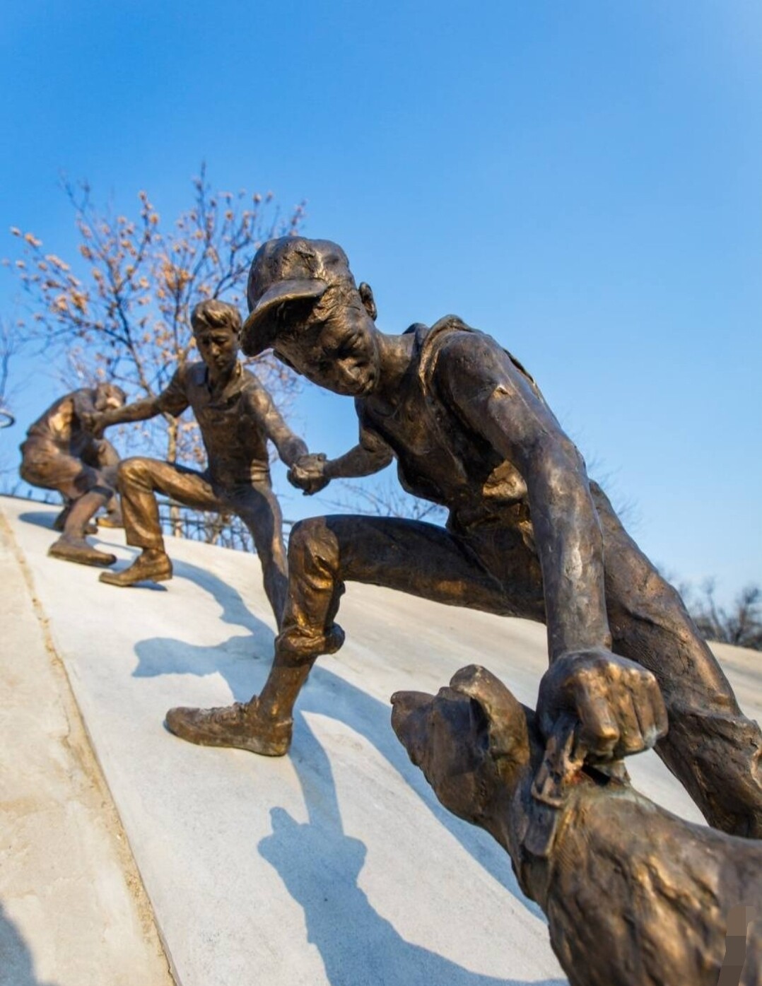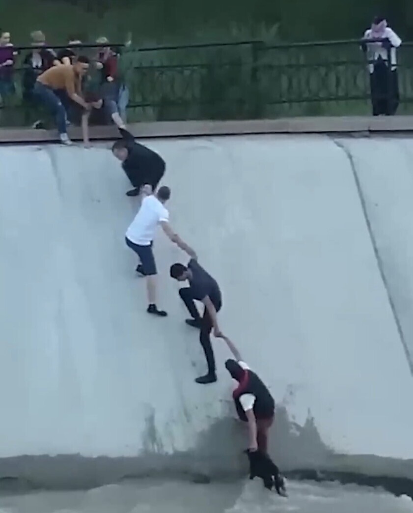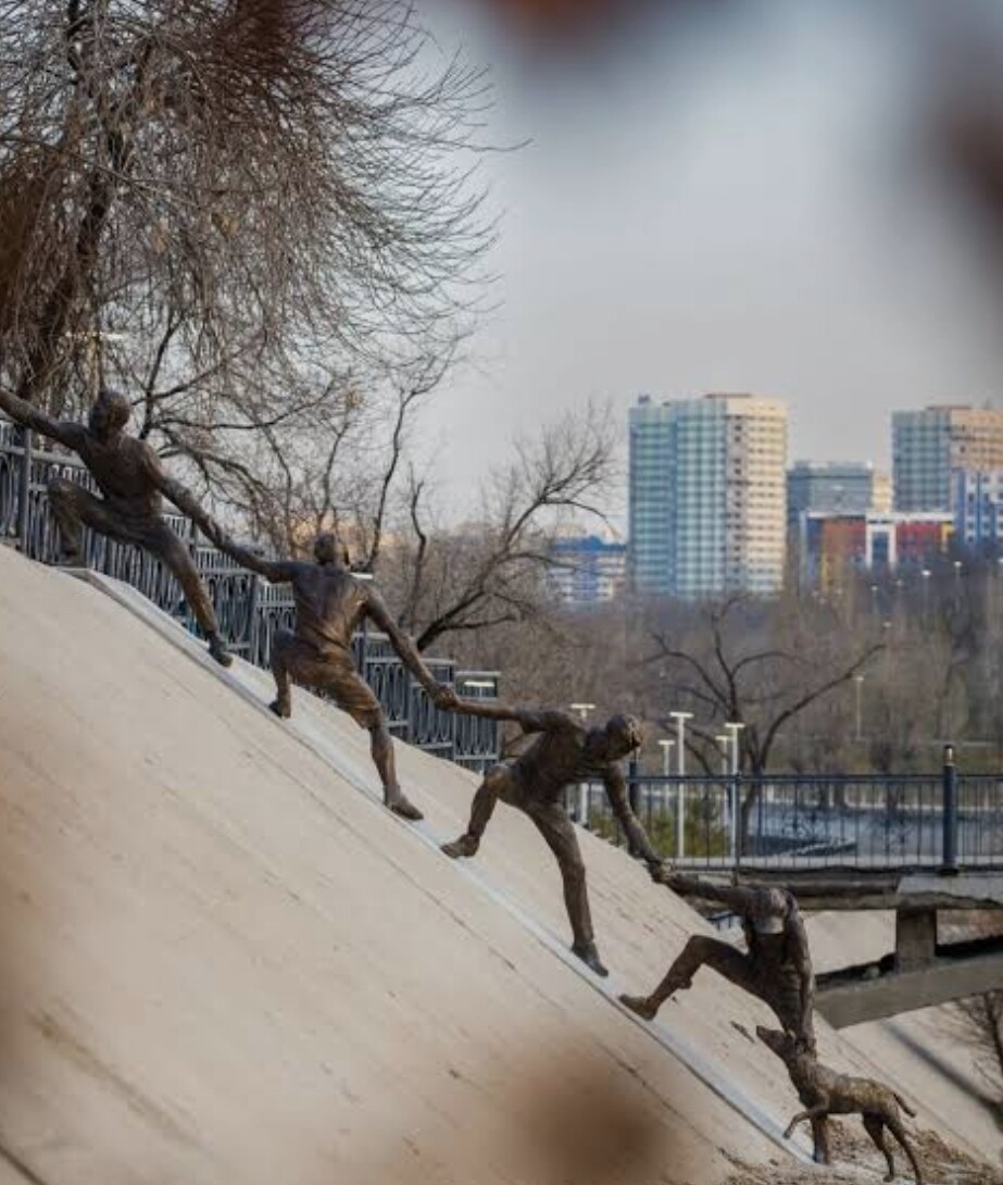 2016年夏天,哈萨克斯坦的阿拉木图市,一只狗意外落入山洪泄洪渠内,被湍急的水流和湿滑的渠岸困住无法脱身。5名互不相识的路人发现后,手拉手组成人链,成功将狗救起。当时的场面被对岸的路人拍下,在网上传播并得到了人们的欢迎。十年后的今天,阿拉木图人民在事发地建立了一座名为“团结”的互动雕像,纪念这一纯粹的善举和充满勇气与信任的协作。互动雕像装置由青铜制作,包括被救助的狗,以及手拉手组成人链的四名年轻人,人链末端的雕像将手伸向堤岸。而每一位来到雕像前,伸手握住最后雕像伸出的手的路人,都将成为这组互动雕像的“第五位救援者”,实现对十年前场景的再现。