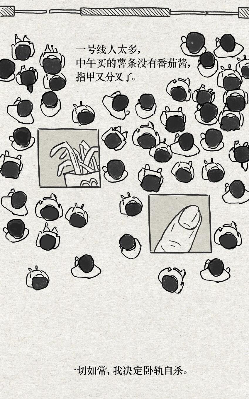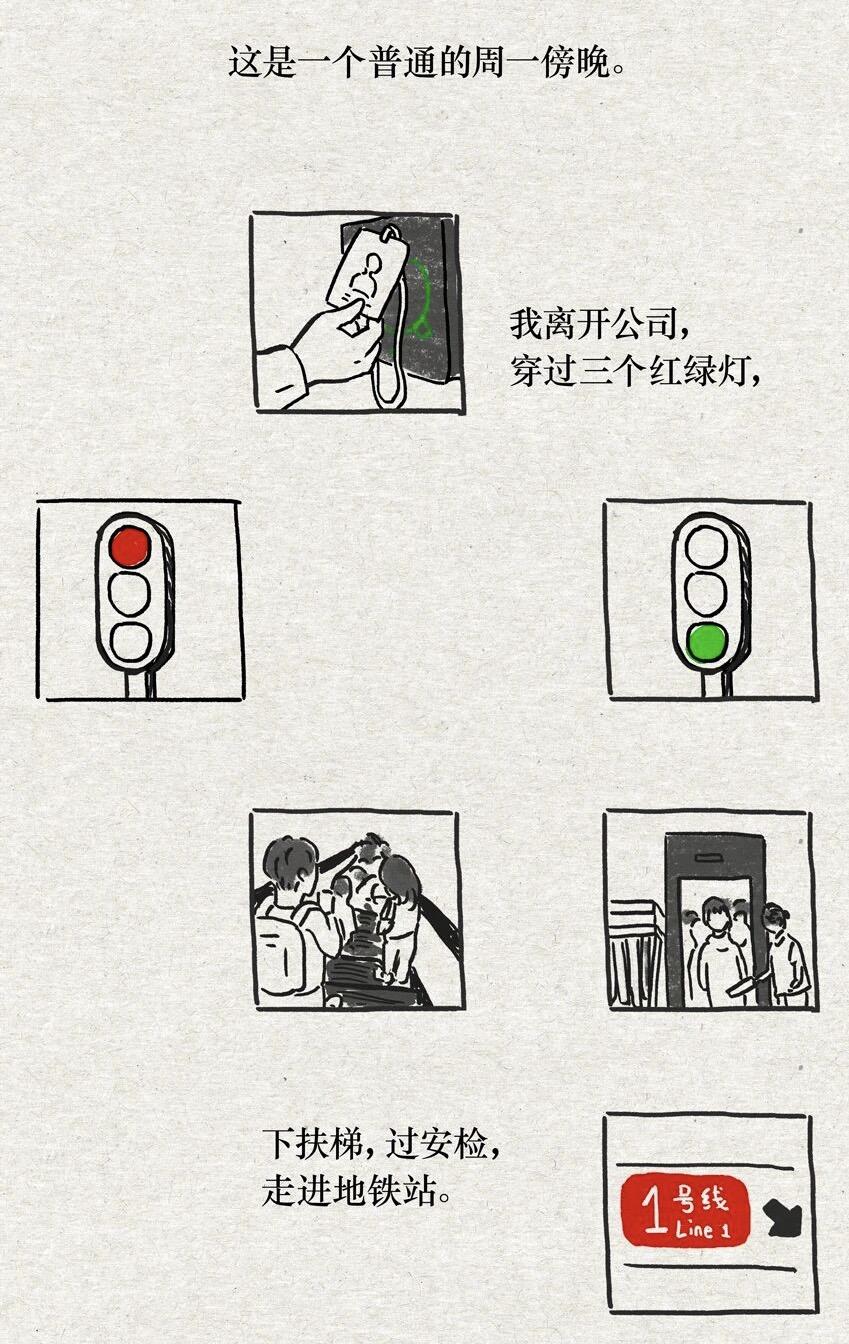 《周一下班去卧轨》,是我近几个月创作的短篇图像小说。每天长达2小时的通勤和永远拥挤的北京一号线,催生了这个怪异的作品。我一直在尝试文本与图像的融合叙事,也喜欢用这种方式来探讨相对深刻的命题,构造我的存在主义寓言(朋友说是都市怪谈🐈