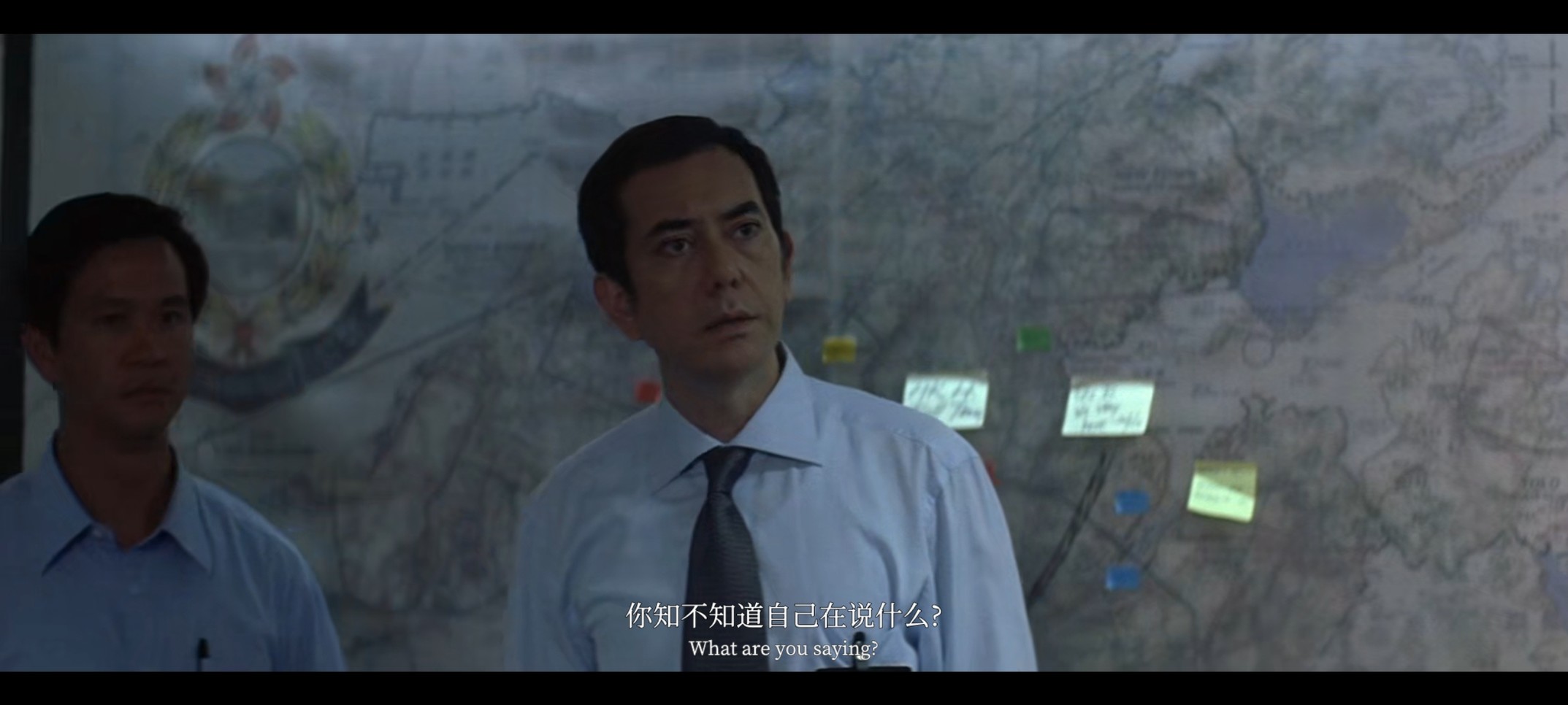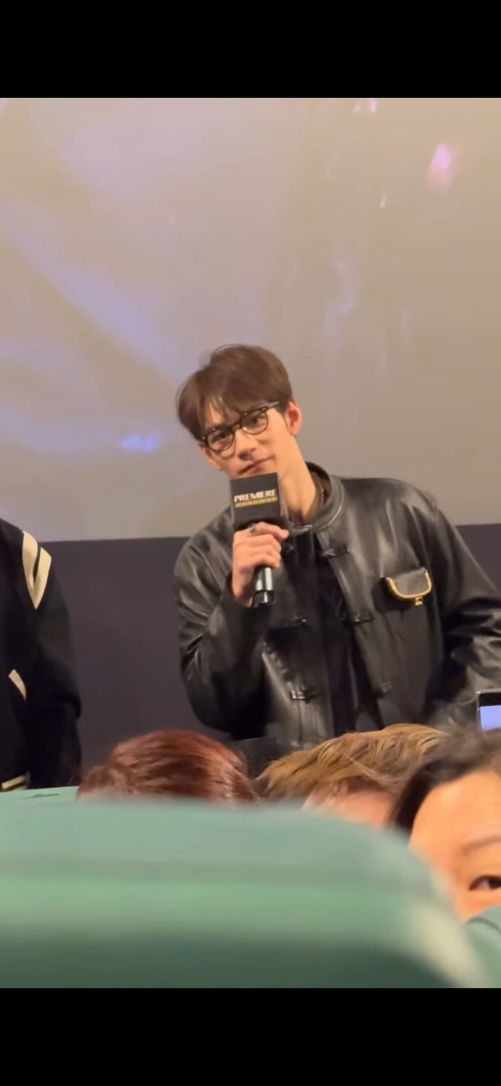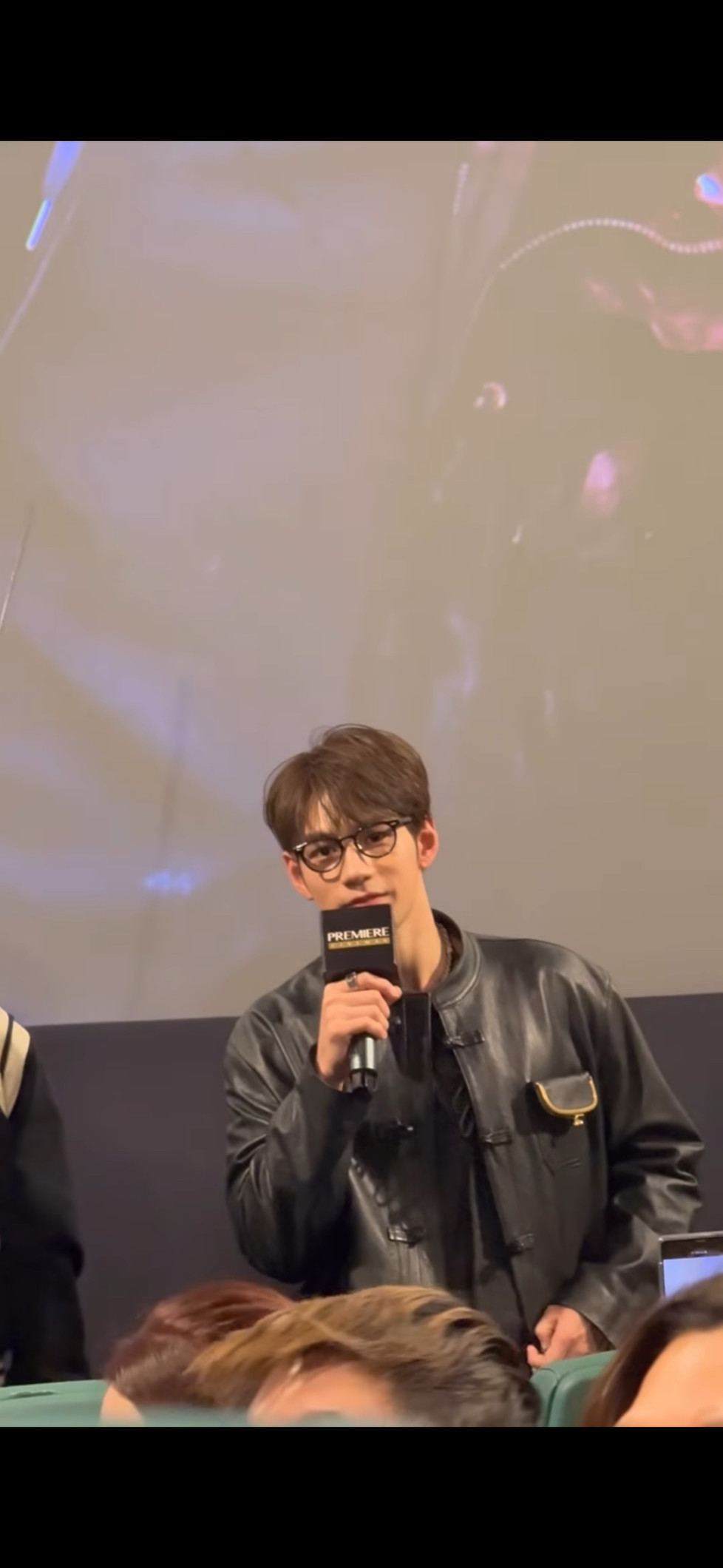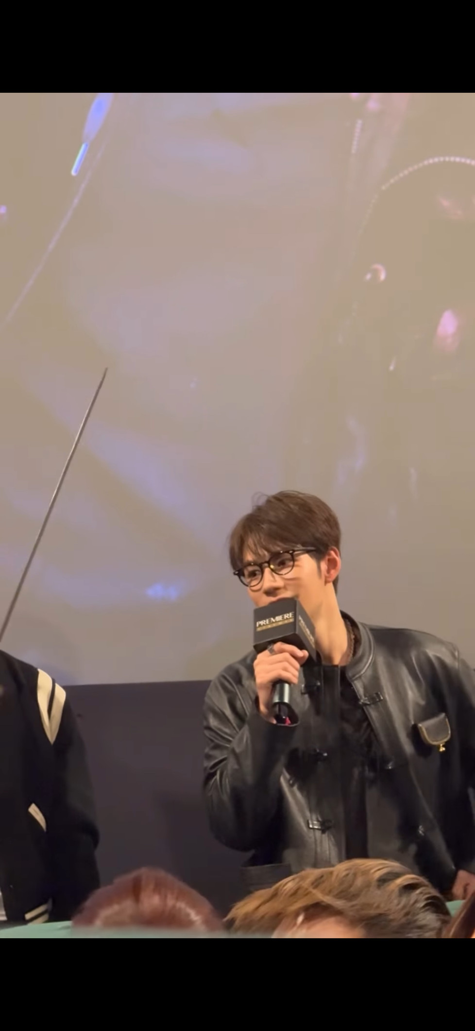 俩人偷偷说啥呢,猜一下应该是梁朝伟不想发言想把话筒给刘华但刘华:(只是安抚)