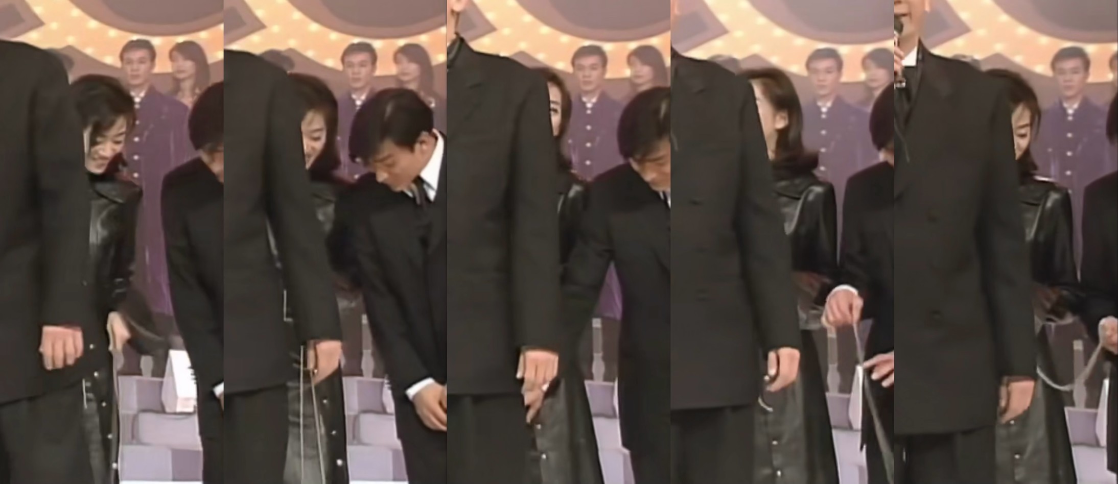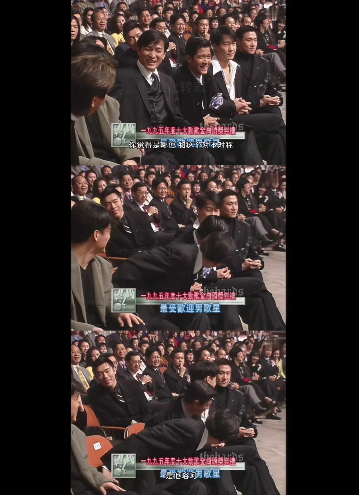 主持人说请颁奖嘉宾把目光对准得奖的那个,旁边人转头看比较近的刘华,刘华和城城哥立刻转头看另两位,Leon立刻也转头看树,好萌